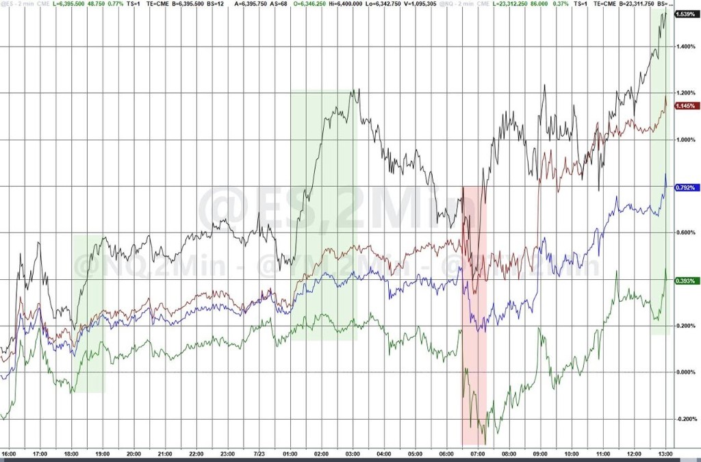 - 美股盘中,华尔街见闻撰文,媒体称欧美接近达成协议、美将对欧盟征 15% 关税。风险情绪被彻底点燃。标普 500 指数涨近 0.6%,道指涨超 370 点、涨逾 0.8%。