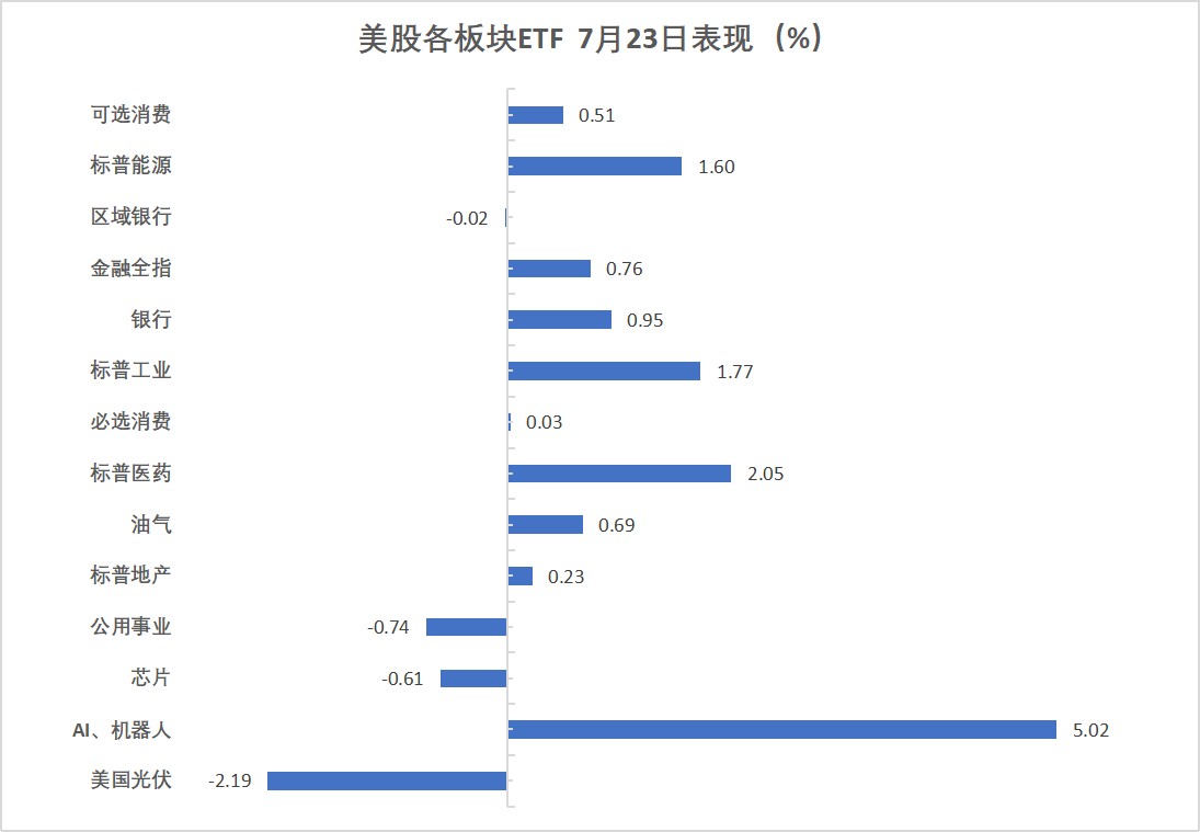 - AI 板块大涨 5.02%,领涨美股各版块。医药板块涨 2.05%,工业 ETF 涨 1.77%,能源板块涨 1.60%。