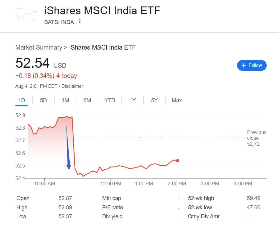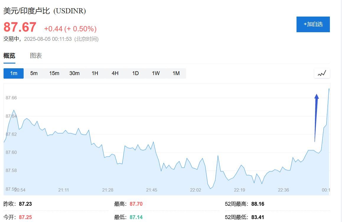 特朗普发出提高关税的威胁后,美股早盘曾涨逾 0.3% 的在美上市印度 ETF 盘中迅速转跌,美股早盘尾声时刷新日低、日内跌近 0.7%。印度卢比兑美元跌幅扩大至超 0.9%。