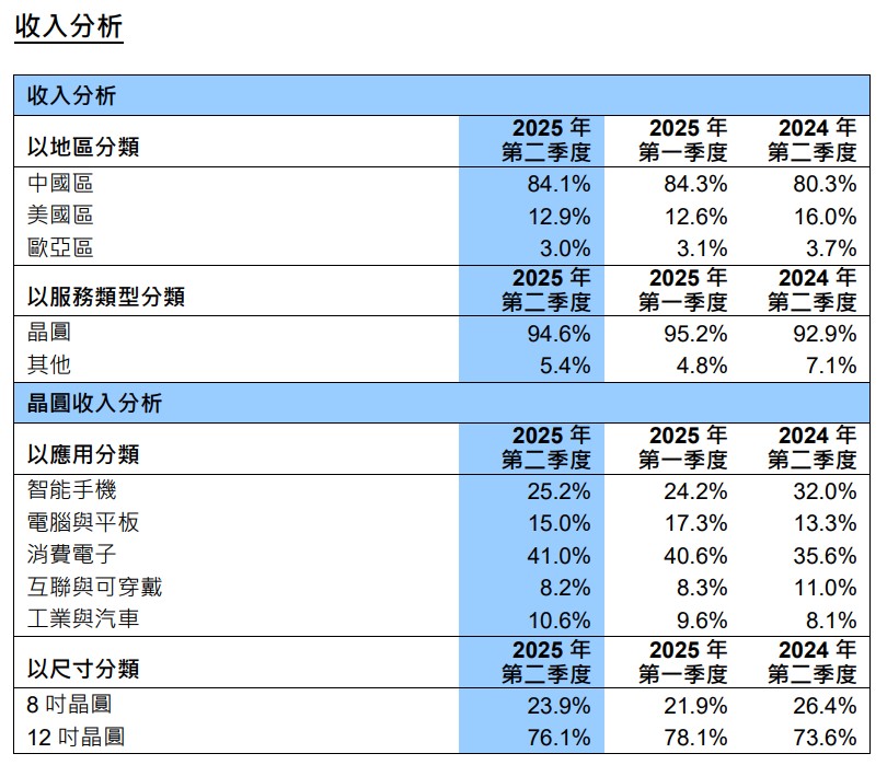 从结构来看,12 吋晶圆占比 76.1%,略低于 Q1 的 78.1%,但仍是营收主力。应用端,消费电子占比高达 41.0%,智能手机占比 25.2%,工业与汽车应用占比 10.6%,较去年同期的 8.1% 有所提升,反映公司在高价值应用领域的渗透。