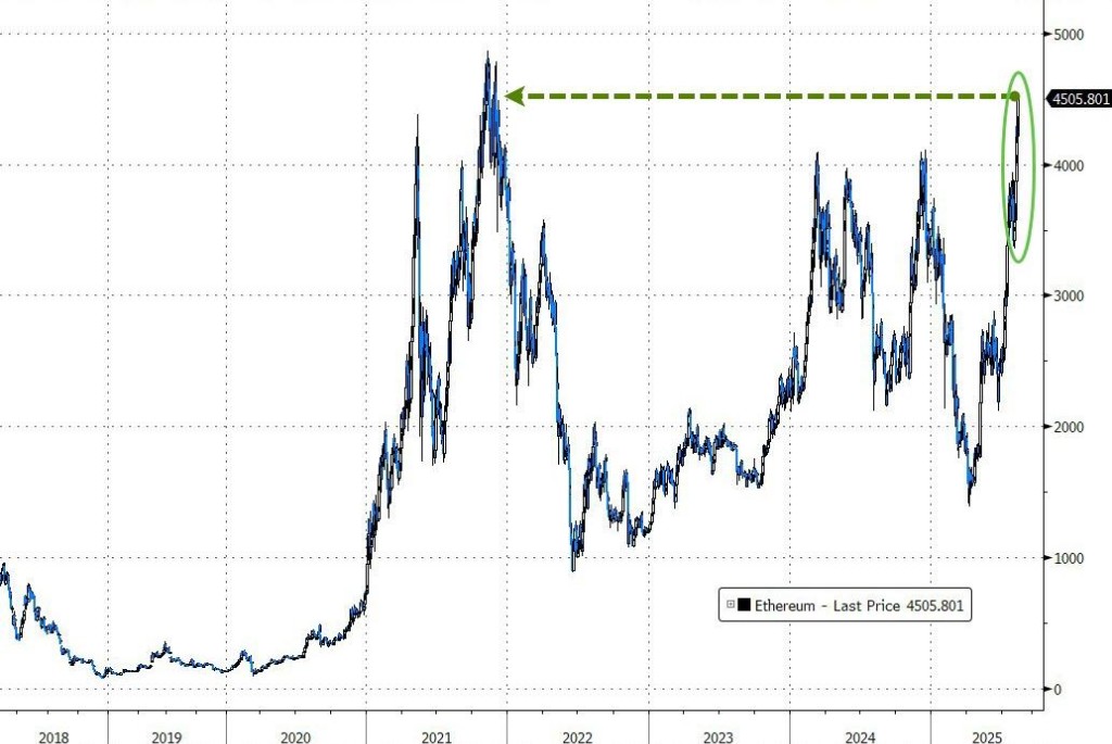 全球贸易乐观情绪提振投资者信心,同时美国 7 月 CPI 数据巩固了市场对美联储 9 月降息的预期,美元和美债收益率遭挫。风险偏好情绪大振,纳指与标普 500 齐创历史新高。罗素小盘股指数则表现最佳,创下今年五月以来表现最佳的一天。以太坊大涨 400 美元,时隔近四年重回 4500 美元上方。