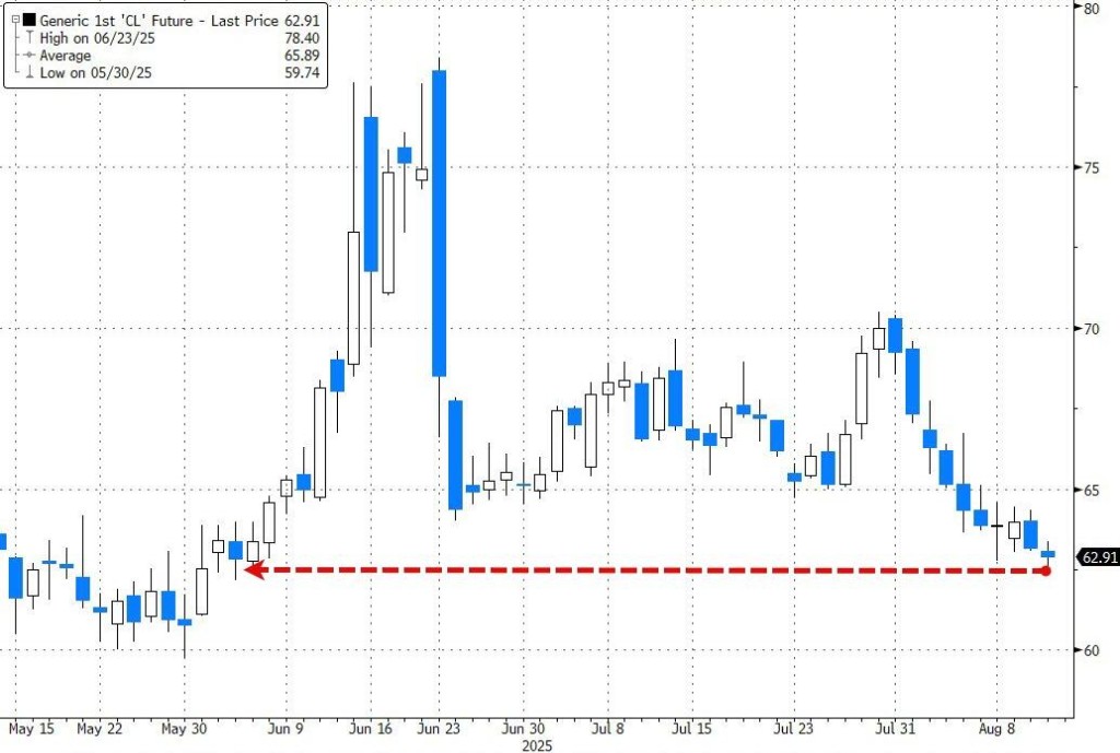 美国原油期货收跌超 0.8%,投资者静待普京和特朗普在阿拉斯加会晤。