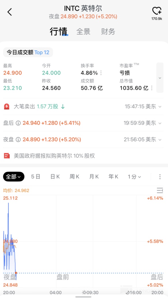 英特尔夜盘涨超 5%!特朗普政府考虑入股 10%,或成最大股东