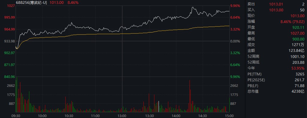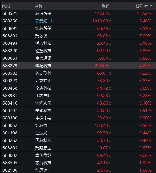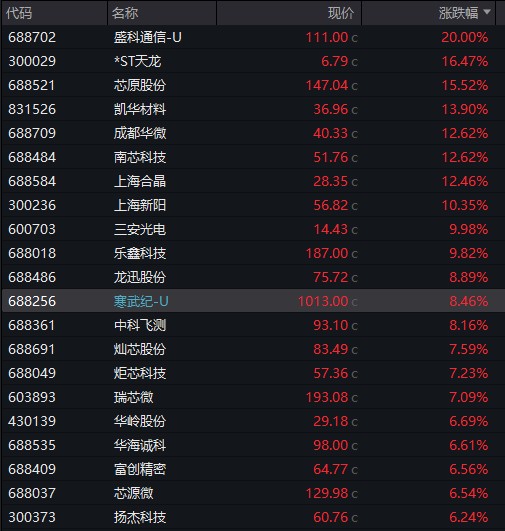 从概念板块来看,GPU、服务器、ASIC 芯片等概念股集体上涨,其中浪潮信息涨停,寒武纪大涨超 8%,股价再度突破 1000 元,成为目前市场上第二只千元股。翱捷科技、中兴通讯、江丰电子等涨幅居前。