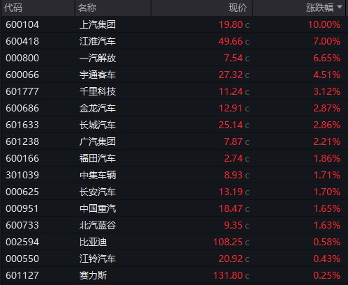 汽车整车板块午后拉升,上汽集团涨停,江淮汽车、一汽解放、宇通客车等跟涨。
