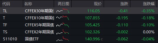债市:国债期货午后回吐此前涨幅,悉数由涨转跌,截至收盘,30 年期主力合约跌 0.35%,10 年期主力合约跌 0.18%,5 年期主力合约跌 0.10%,2 年期主力合约跌 0.00%。