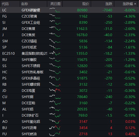 债市方面,国债期货午后持续回落,回吐早盘涨幅之后全线转跌,30 年期主力合约跌 0.35%。商品方面,国内商品期货普遍下跌,碳酸锂期货跌停,焦煤、焦炭等跌幅居前。