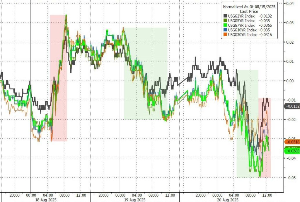 美股午盘,美联储公布 7 月会议纪要,多数委员认为通胀比就业风险高,担心美债市场脆弱。强硬的会议纪要导致股市短线下跌,美债收益率上升,但逢低买入的投资者支撑美股。英伟达跌幅大幅收窄至 0.14%,Palantir 早盘一度重挫 9%,最终跌幅收窄至 1.1%。