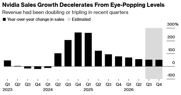 英伟达 (NVDA.US) 最新指引显示出,两年的高速增长之后将出现放缓趋势,“AI 信仰” 受挫了?