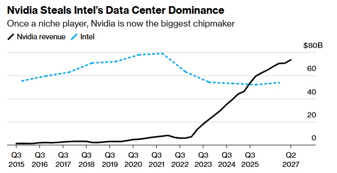 就在 2022 年,英伟达的规模还只是英特尔的几分之一,英特尔一年的营收还不到如今它一个季度的营收。如今,英伟达的年销售额有望达到 2000 亿美元——预计到 2028 年这一数字将超过 3000 亿美元。这将使该公司占据芯片行业总收入的约三分之一。