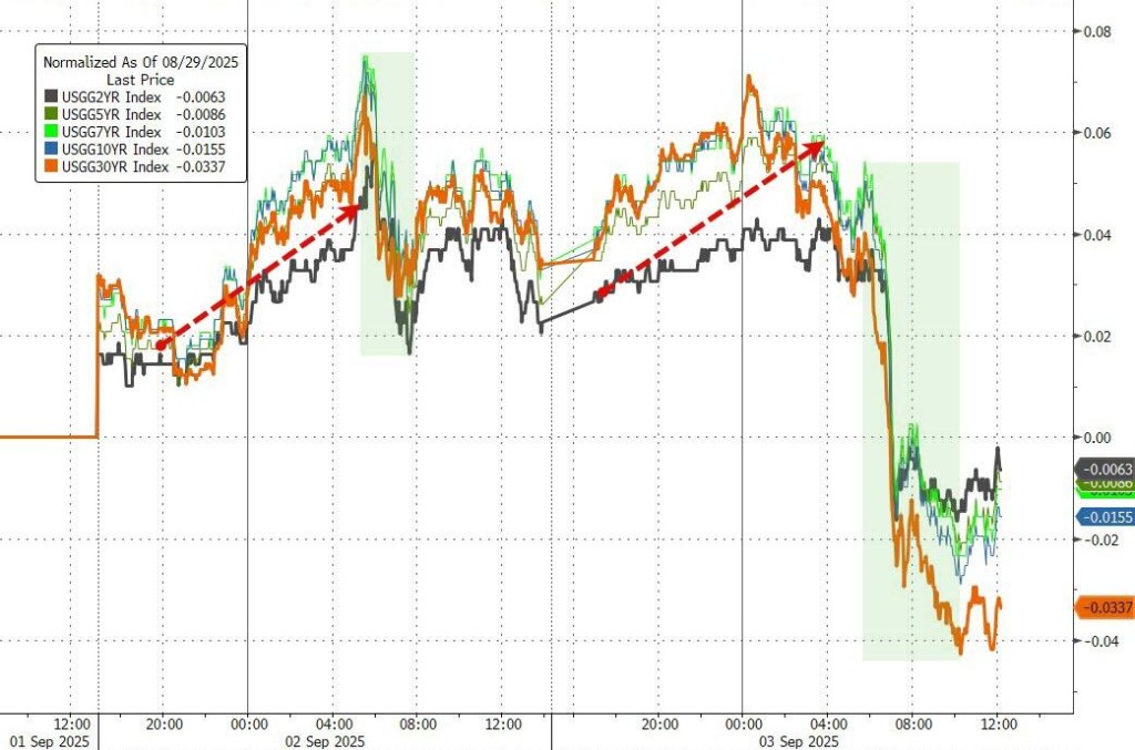 疲软劳动力数据影响,美债收益率全线下挫,10 年期收益率跌超 4.2 基点。30 年期收益率日内触及 5% 后快速下跌、较日高跌逾 10 基点。全球债市抛售过后,德债价格反弹,30 年期德债收益率则跌超 5 个基点。