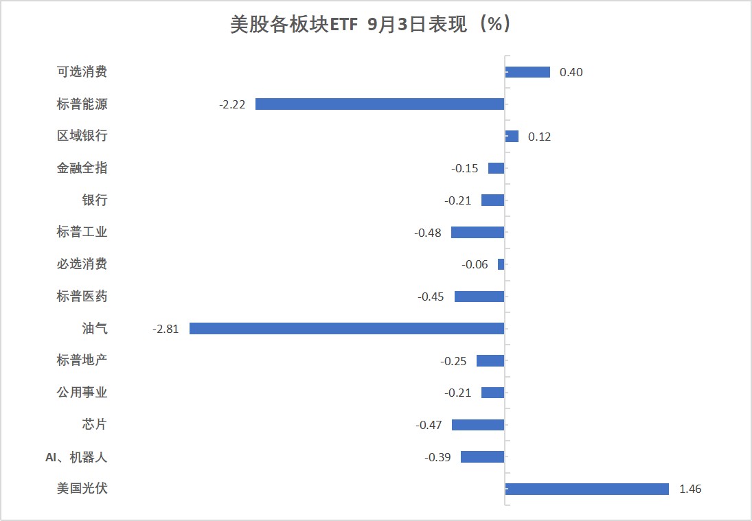 受原油价格下挫影响,标普能源和油气板块跌超 2.2%。区域银行则上涨 0.12%,可选消费涨 0.4%,美国光伏涨 1.46%。