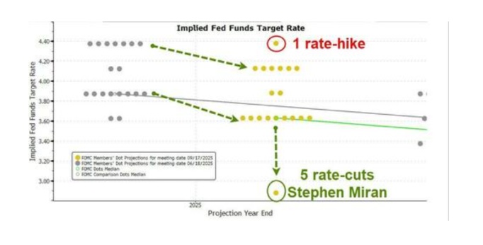 然而,真正的 “意外” 藏在细节之中。最新的 “点阵图” 显示,在 19 名 FOMC 成员中,有 12 名预计今年至少还会再降息一次(其中 9 名预计两次,2 名预计一次,1 名甚至预计五次),这比他们在 6 月份的预测多了一次,释放了比预期更强的鸽派信号。