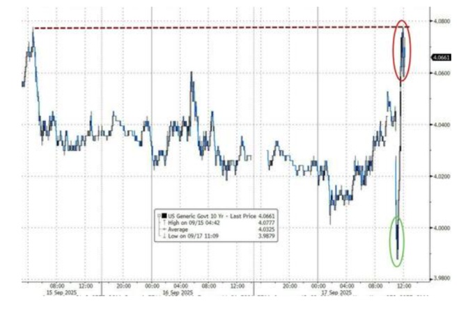 但随着鲍威尔开始讲话,市场风向迅速逆转。美债收益率飙升,10 年期国债收益率在短暂跌破 4.00% 后迅速反弹至日内高点。