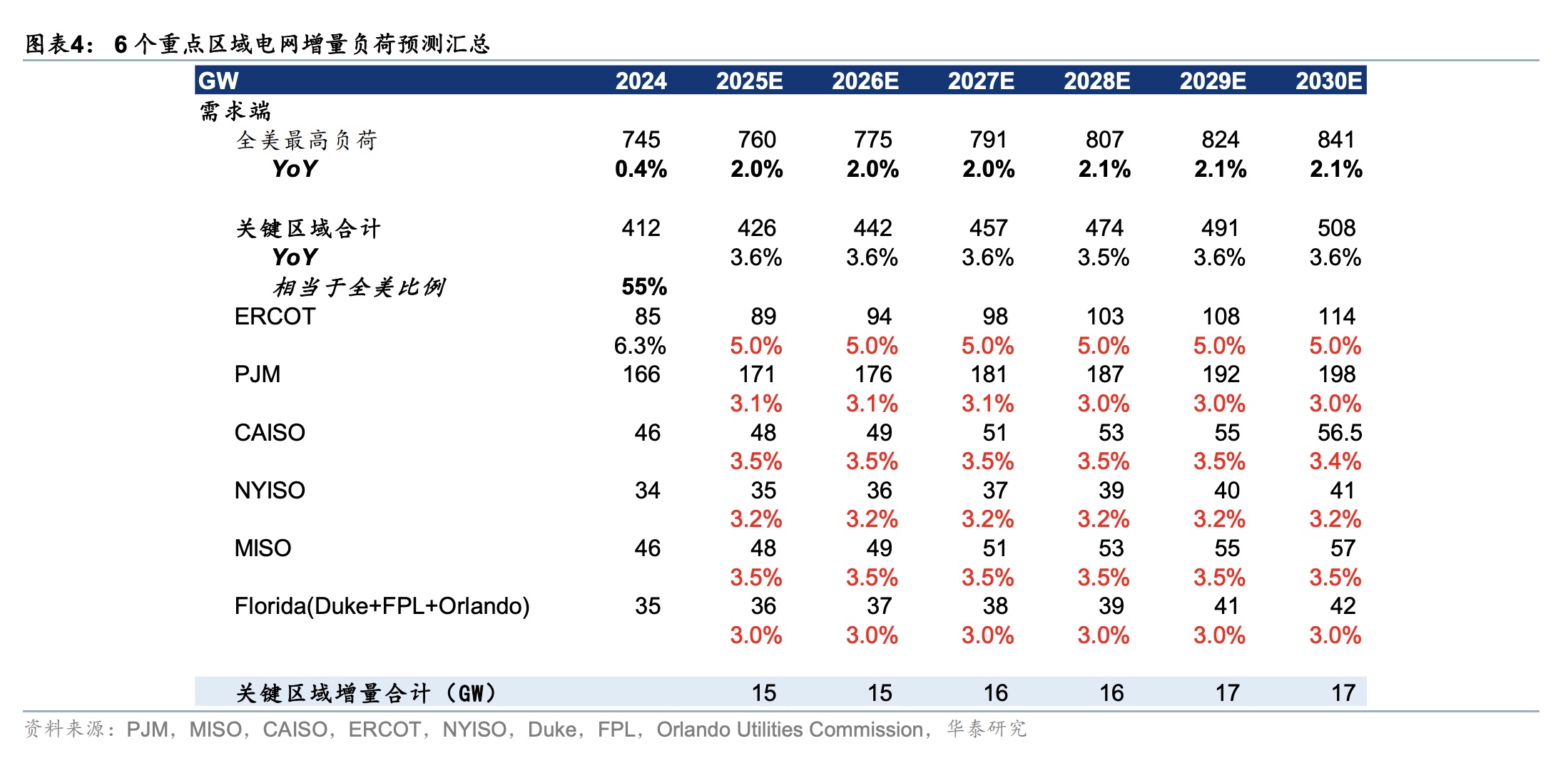 华泰证券表示,6 个重点区域(占美国最高负荷 55%,涵盖主要数据中心聚集州)的增量负荷预测年均在 15GW 以上,意味着非数据中心年均也将有 2GW 以上的增量负荷。综合测算,美国最高负荷有望保持 2% 以上增速,相比 2016-2024 年 0.5% 的复合增长率翻了两番。