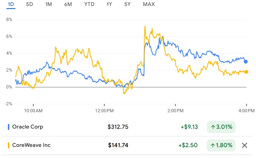 这一数据披露后,市场对 AI 基础设施业务盈利能力的信心增强,甲骨文股价收涨超 3%,盘中一度上涨超 5%,同时也带动同行业公司 CoreWeave 股价上扬。