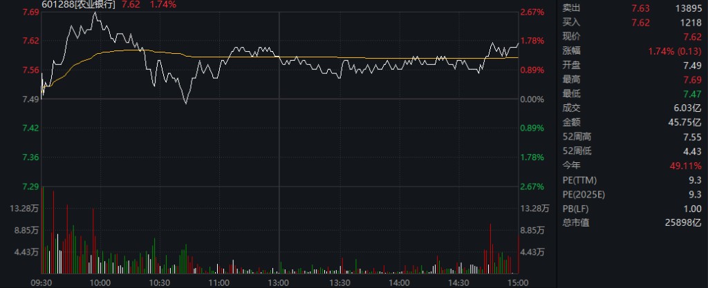 今天,银行股成为市场不多的亮点,不过午后也是遭到大盘指数下跌所拖累,农业银行仍然创下历史新高,总市值达到 2.58 万亿元,此前录得 10 连阳。