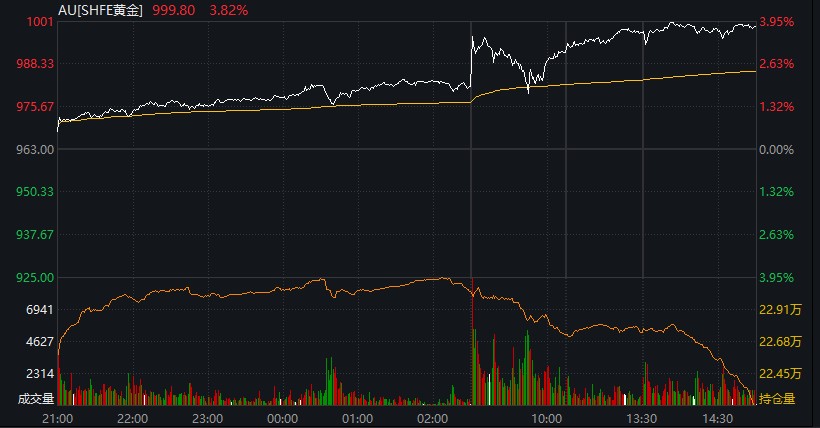 在国际黄金大涨的推动下,沪金盘中突破千元大关,创下历史新高,截至收盘,沪金涨 3.82%,报 999.80 元/克。