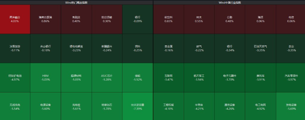 具体来看,福建本地股逆势走强,平潭发展、厦门港务等涨停。银行板块表现较强,农业银行创新高。海南自贸港概念拉升,海峡股份封板。黄金股延续强势,白银有色等涨停。下跌方面,数据中心电源概念走低,中恒电气等跌停;光伏、储能等新能源方向下挫,阳光电源跌超 10%。