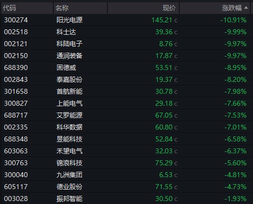 光伏逆变器概念股中,阳光电源跌超 10%,固德威、上能电气、昱能科技等纷纷下跌。