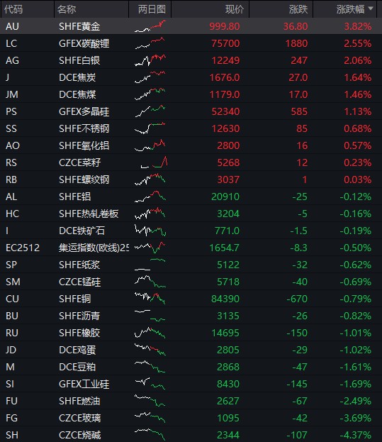 商品:国内商品期货分化,截至收盘,烧碱跌超 4%,玻璃、LU 燃油跌超 3%,生猪、菜粕等跌逾 2%,PP、工业硅等跌超 1%,沪锌、花生等小幅下跌;沪金涨超 3%,碳酸锂、沪银涨逾 2%,焦炭、焦煤等涨超 1%,豆一、尿素等小幅上涨。