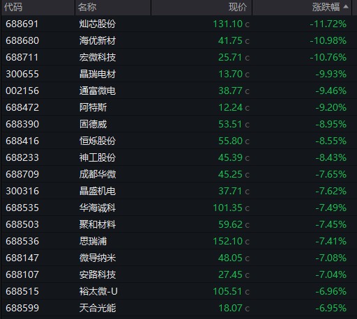 具体来看,半导体板块中,灿芯股份、海优新材、宏微科技等跌幅居前。