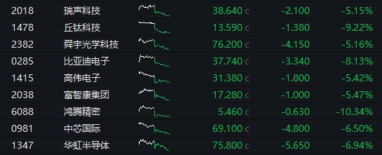盘面上,科技股全线走弱,中兴通讯跌近 13%,中芯国际、华虹半导体双双跌超 6%;有色行业普跌,洛阳钼业跌近 6%;黄金零售股逆势走强,周大福涨 5%。