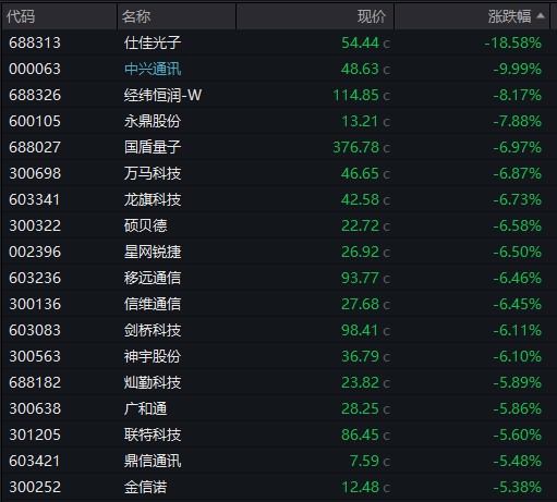 通讯设备板块中,仕佳光子跌近 20CM,中兴通讯跌停,国盾量子、万马科技、硕贝德等跟跌。