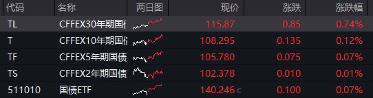债市:国债期货全线反弹,截至收盘,30 年期主力合约涨 0.74%,10 年期主力合约涨 0.12%,5 年期主力合约涨 0.07%,2 年期主力合约涨 0.01%。