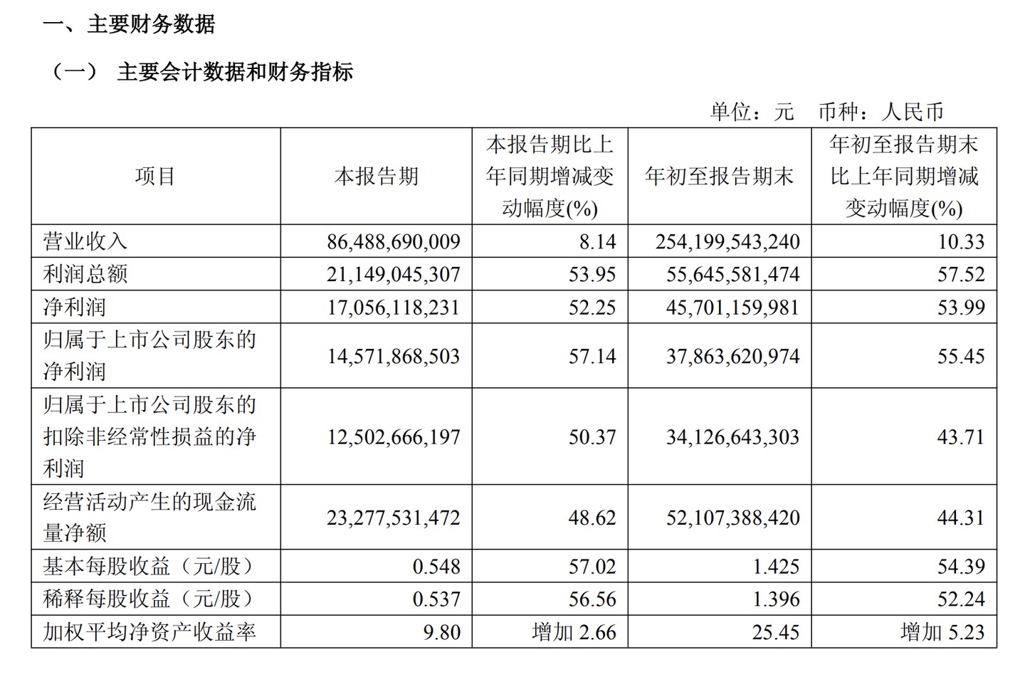 - 前三季度归母净利润 378.64 亿元,同比增长 55.45%;扣非净利润 341.27 亿元,同比增长 43.71%
