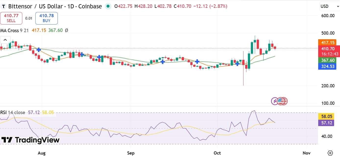 TAO Synergies 在价格下跌期间收购了超过 54,000 个 Bittensor (TAO) 代币,成为最大的上市持有者。尽管通过私募筹集了 1100 万美元用于进一步收购,但由于其他投资者持续抛售,TAO 的价格仍然承压。目前交易价格为 404 美元,TAO 已下跌 10.42%。虽然 TAO Synergies 的积累策略使其市值增长了 59%,但看跌的市场环境依然占主导地位,暗示 TAO 可能面临进一步的损失
