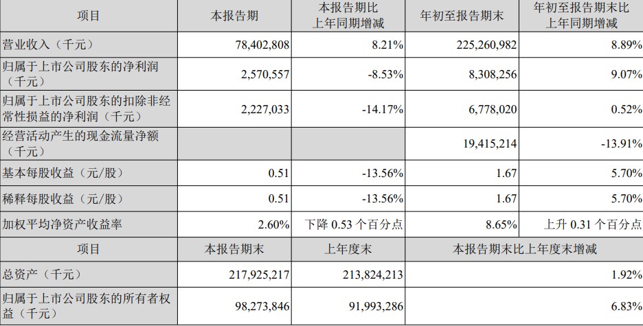 - 前三季度营收 2252.6 亿元,同比增 8.89%;归母净利润 83.1 亿元,同比增 9.07%;