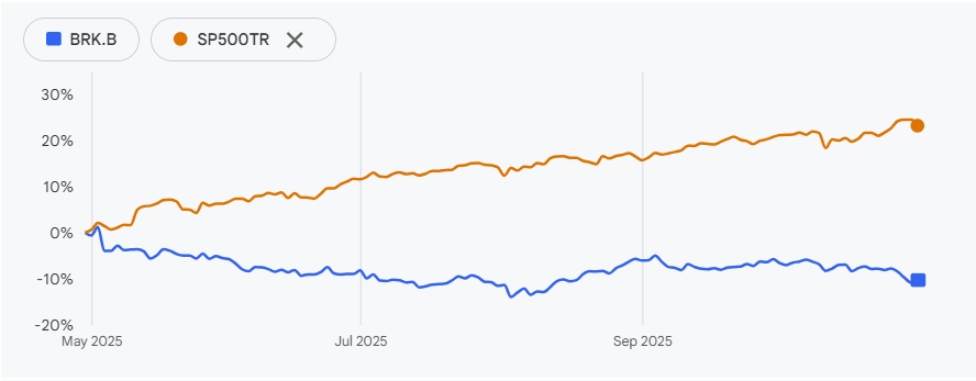伯克希尔今年股价表现落后基准指数的幅度,创下 2020 年以来最大。