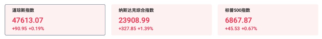 - 美股指数集体走高,纳指涨 1.5%,道指涨 0.2%,标普 500 指数涨 0.8%。