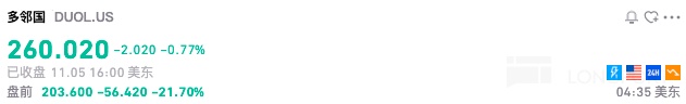 11 月 6 日(周四),美股盘前多邻国大跌超 21%,Q4 预订量指引低于预期,日活用户数增速或放缓。