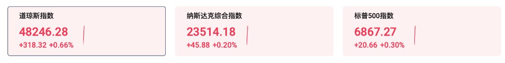- 美股指期货集体上涨,标普 500 指数高开 21.16 点,涨幅 0.31%,报 6867.77 点;道琼斯工业平均指数高开 87.83 点,涨幅 0.18%,报 48015.79 点;纳斯达克综合指数高开 95.54 点,涨幅 0.41%,报 23563.84 点