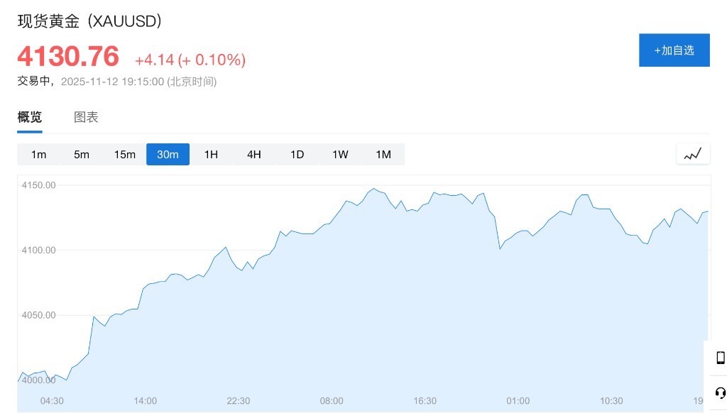 现货黄金涨 0.1% 至 4130 美元/盎司。