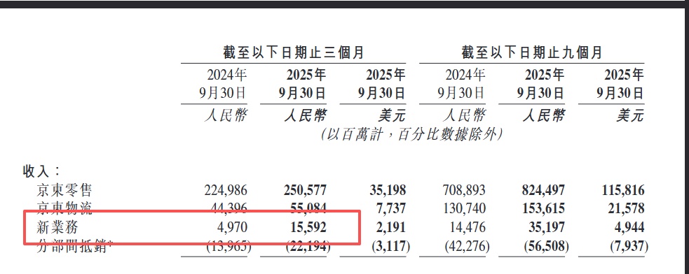 财报称,2025 年三季度,新业务收入 155.92 亿人民币,同比增长 213.9%。新业务主要包括京东外卖、京东产发、京喜及海外业务。