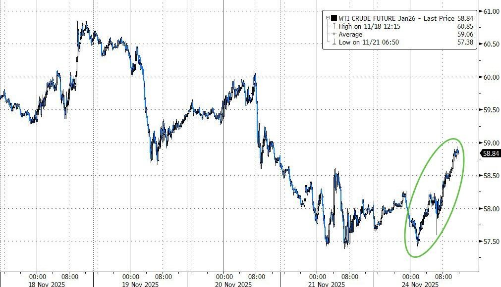 美股午盘,华尔街见闻撰文,俄乌和谈仍在博弈之中,俄罗斯方面表示欧洲提出的和平方案不具建设性。原油扭转上周颓势,WTI 原油一度较日低涨近 3%。