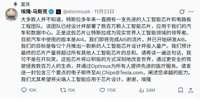 他在推上表示,特斯拉不仅能造车,更是一家 AI 芯片公司。多年来,特斯拉一直有一支神秘的芯片团队,设计并部署了数百万颗 AI 芯片,跑在汽车和数据中心里,让特斯拉在人工智能赛道上领先别人好几条街。