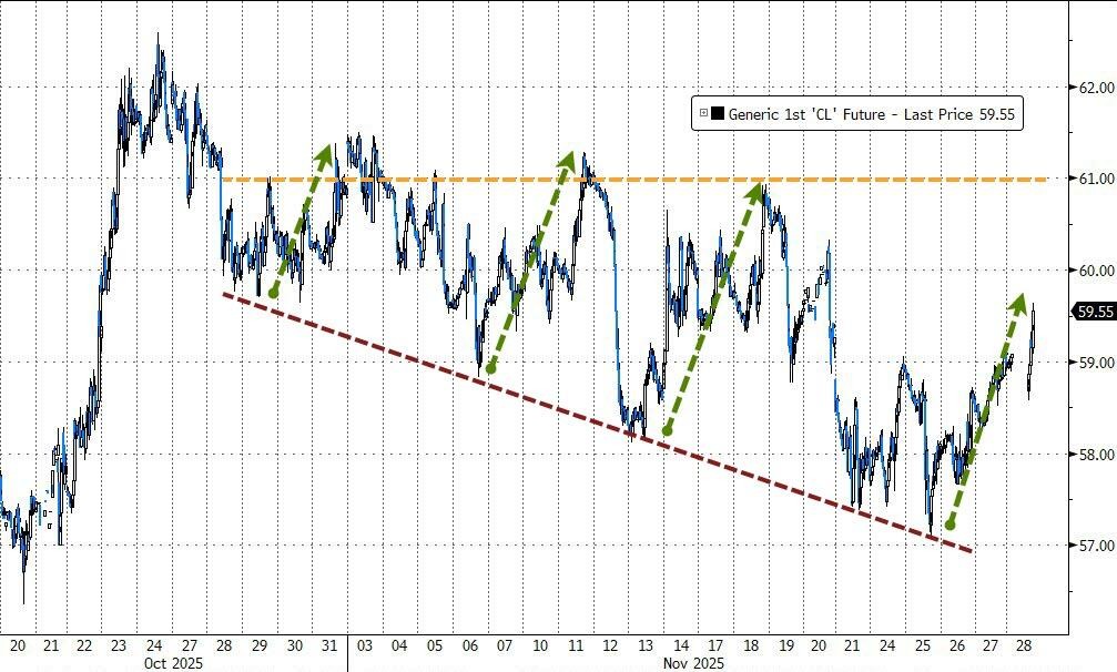 WTI 1 月原油期货收报 58.55 美元/桶,11 月份累计下跌超过 3.38%。