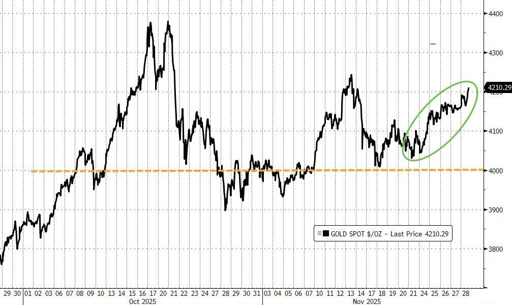 黄金涨 1.5%,重回 4200 美元,创近两周来新高,连续第四个月上涨。白银飙升 6% 创历史新高,连涨七个月。伦铜 11 月涨超 2.7%。