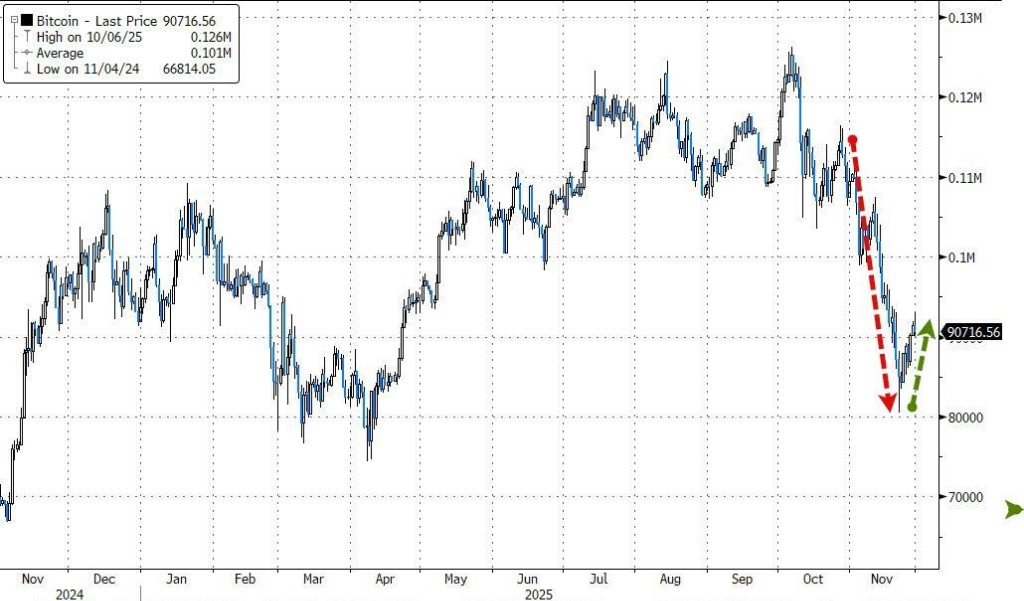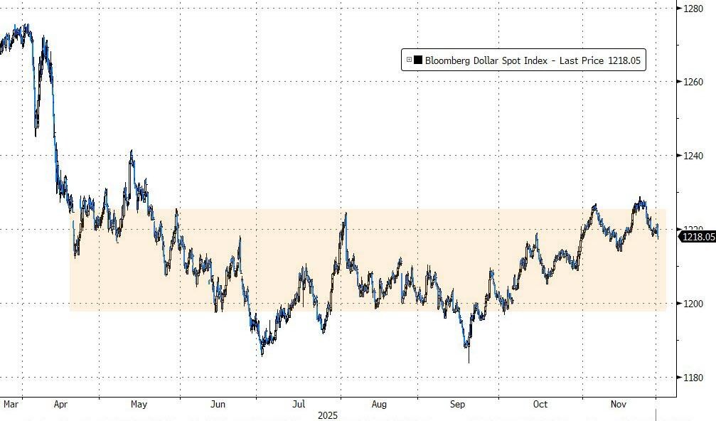 美元指数 11 月份跌超 0.3%,重新逼近百月均线。加密货币日内窄幅波动,比特币创 2022 年 6 月以来最大的单月跌幅,本月一度跌至 8 万美元。