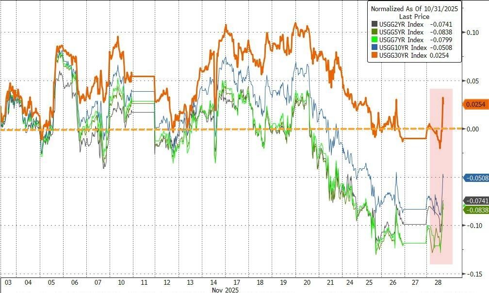 美债收益率反弹,10 年期涨 2 基点、重回 4% 上方。两年期美债收益率 11 月份跌超 8 个基点。
