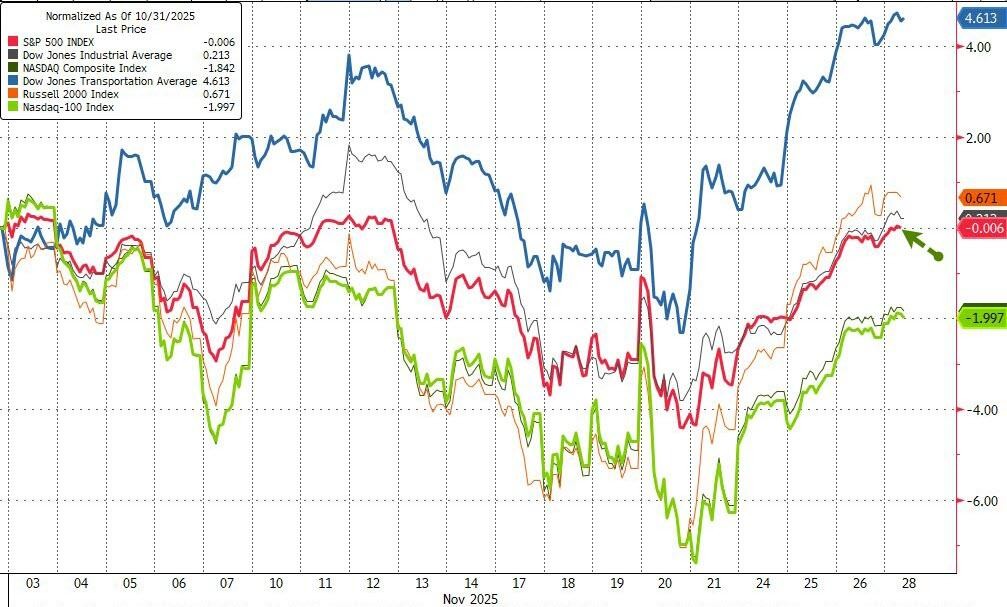 周五,美股因感恩节提前收盘,芝商所宕机导致交易暂停未减缓市场上涨势头,市场对美联储 12 月降息的预期持续发酵,标普 500 连续第五个交易日上涨、录得 2008 年来最佳感恩节周表现,为动荡的 11 月画上句号。