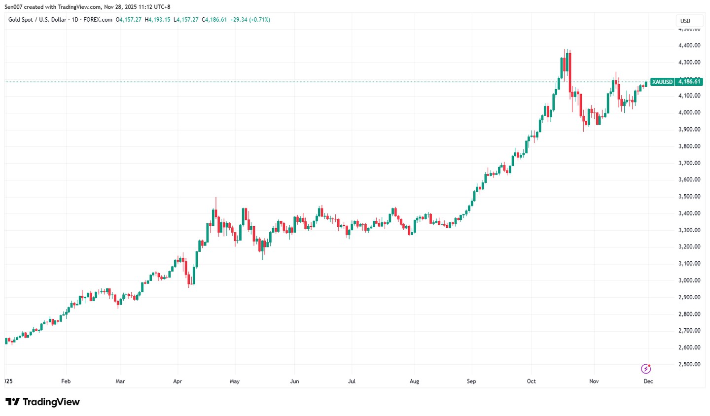 11 月 28 日,黄金价格涨至 4193 美元/盎司,创两周新高。白银价格涨至 54 美元/盎司,逼近历史高点。