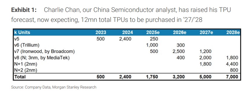 根据大摩亚洲半导体分析师 Charlie Chan 的监测,供应链端传出了明确的 TPU 订单增加信号。基于此,大摩对未来的 TPU 供应量进行了修正: