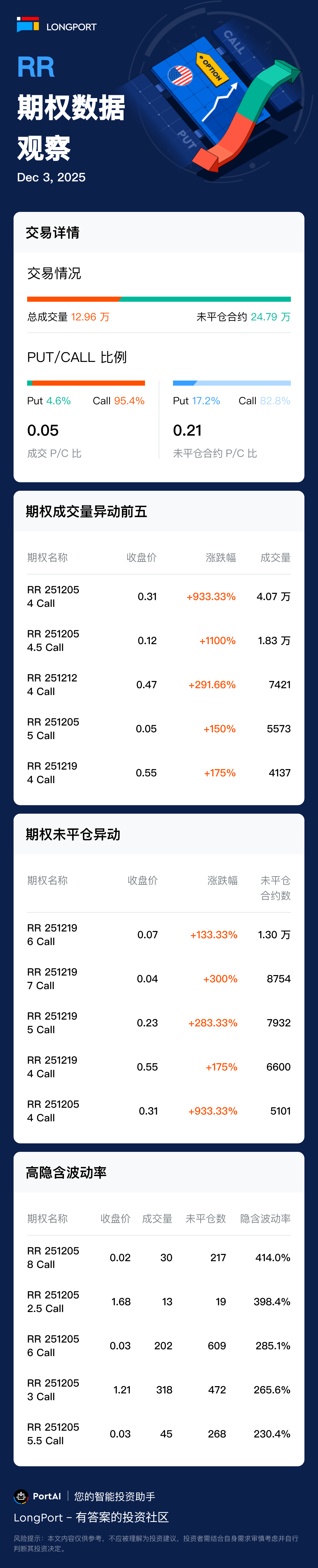 美东时间 12 月 03 日,RR 期权总成交 129577 张,看涨期权占比 95%,看跌期权占比 4%。