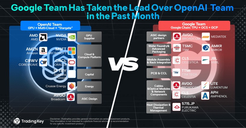 TradingKey - 在过去一个月中,人工智能相关的市场流动出现了分化。自从 Gemini 3 发布以来,Alphabet 的股票大幅上涨,而与 OpenAI 生态系统相关的公司则受到压力。投资者正在将投资重心转向与谷歌对齐的公司,尤其是博通(Broadcom,AVGO)。