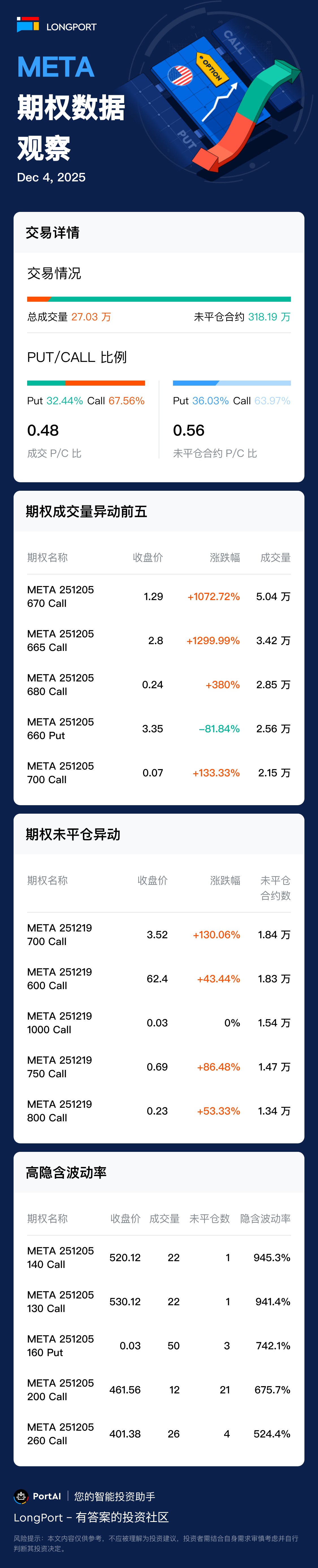 美东时间 12 月 04 日,Meta 期权总成交 270321 张,看涨期权占比 67%,看跌期权占比 32%。